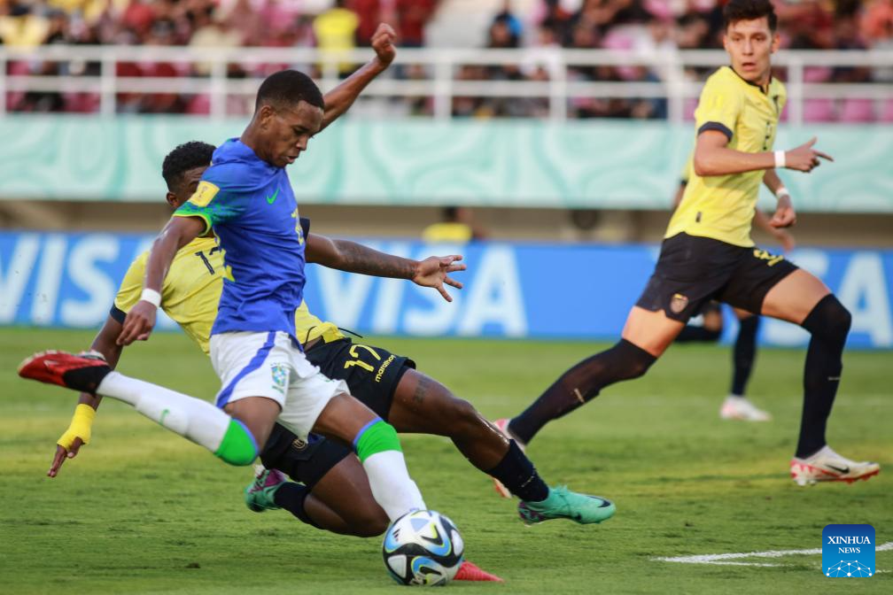 Estevao (front) of Brazil competes during the round of 16 match of the FIFA U-17 World Cup Indonesia 2023 between Ecuador and Brazil at Manahan Stadium in Surakarta, Central Java, Indonesia, Nov. 20, 2023. (Photo by Yanuar/Xinhua)