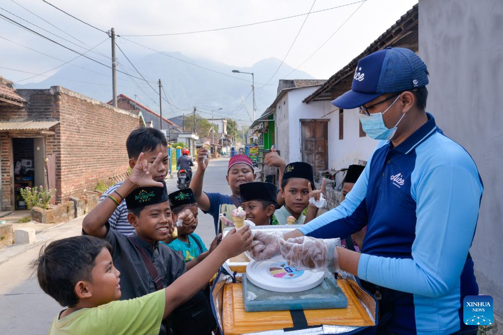 Children buy Aice ice cream from Yusuf Afat's Aice ice cream sales bicycle in Mojokerto, East Java, Indonesia, Sept. 14, 2023. Living in the tropics, the Indonesian people swelter through the scorching weather. Aice, a famous ice cream brand in the country, cools them down and brings joy. (Xinhua/Xu Qin)