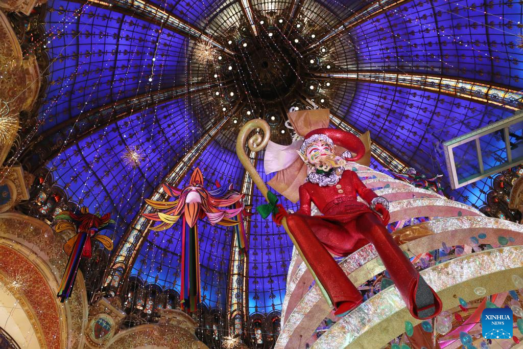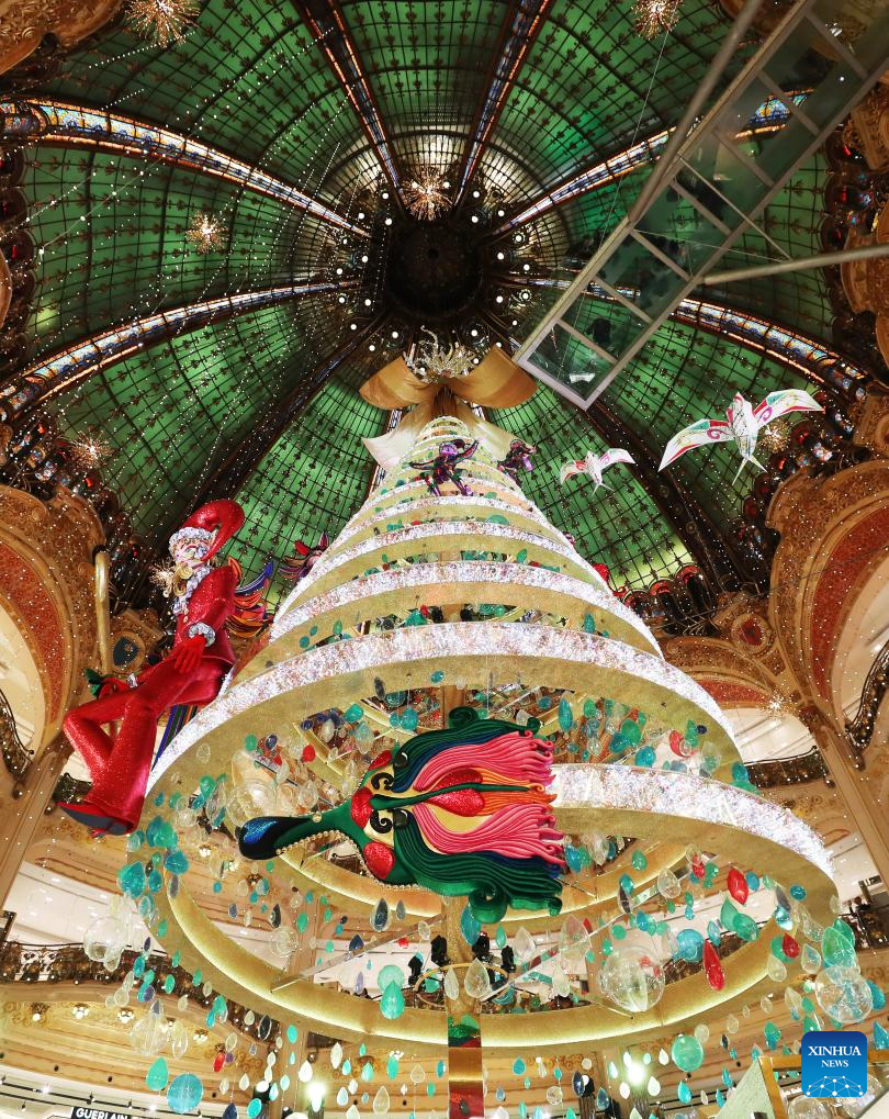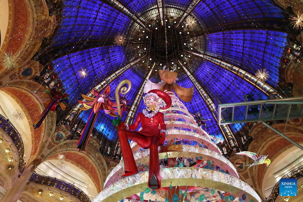 A giant Christmas tree is seen at the Galeries Lafayette department store in Paris, France, Nov. 21, 2023. (Xinhua/Gao Jing)