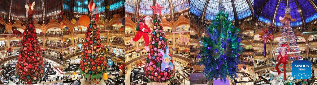 This combo photo (from L to R) shows the giant Christmas trees at the Galeries Lafayette department store in Paris, France from 2019 to 2023. (Xinhua/Gao Jing)