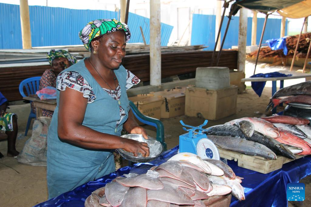 A fresh fish seller puts ice on fish on the occasion of World Fisheries Day in So-Ava, a lakeside town near Cotonou, Benin, on Nov. 21, 2023. (Photo by Seraphin Zounyekpe/Xinhua)