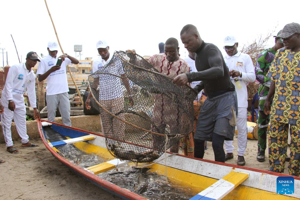 Fishermen dump fish into a canoe on the occasion of World Fisheries Day in So-Ava, a lakeside town near Cotonou, Benin, on Nov. 21, 2023. (Photo by Seraphin Zounyekpe/Xinhua)