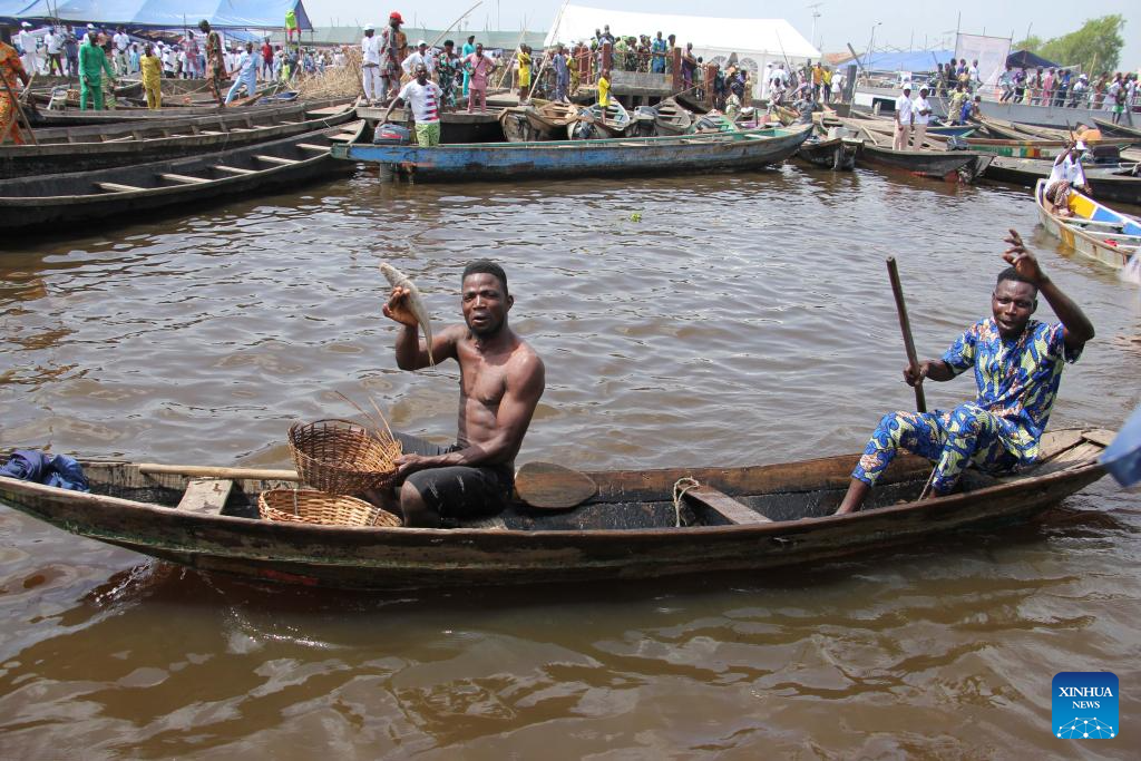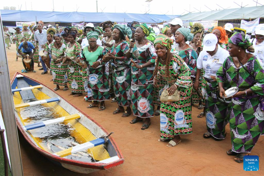 Fish sellers dance on the occasion of World Fisheries Day in So-Ava, a lakeside town near Cotonou, Benin, on Nov. 21, 2023. (Photo by Seraphin Zounyekpe/Xinhua)