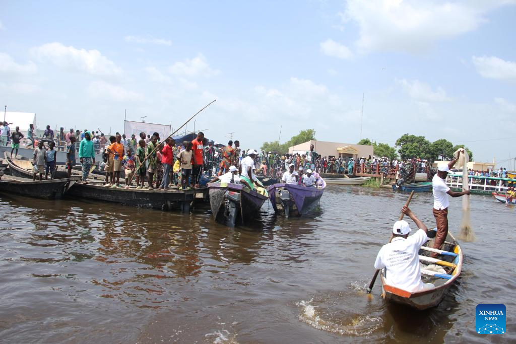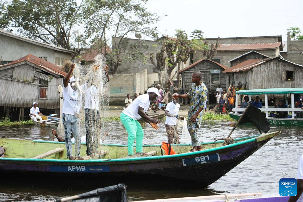 Fishermen catch fish on the occasion of World Fisheries Day in So-Ava, a lakeside town near Cotonou, Benin, on Nov. 21, 2023. (Photo by Seraphin Zounyekpe/Xinhua)