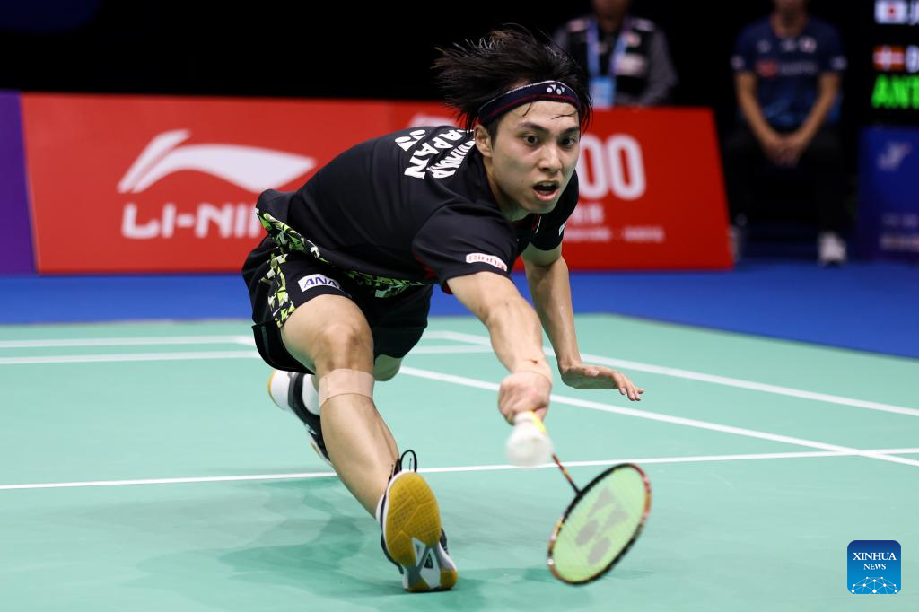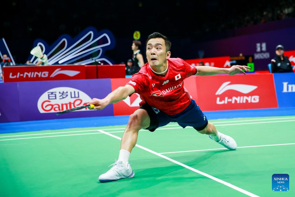 Naraoka Kodai of Japan hits a return during the men's singles second round match against Anders Antonsen of Denmark at the China Masters Badminton Tournament 2023 in Shenzhen, south China's Guangdong Province, Nov. 23, 2023. (Photo by Wu Zhizhao/Xinhua)