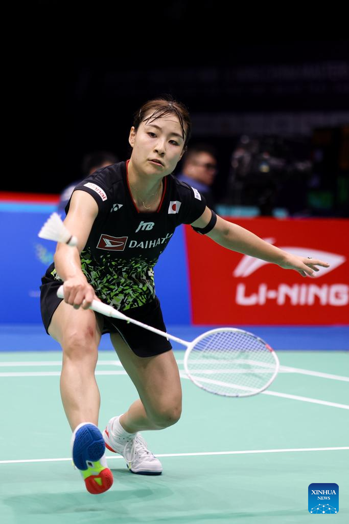 Okuhara Nozomi of Japan hits a return during the women's singles second round match against Gregoria Mariska Tunjung of Indonesia at the China Masters Badminton Tournament 2023 in Shenzhen, south China's Guangdong Province, Nov. 23, 2023. (Photo by Wu Zhizhao/Xinhua)