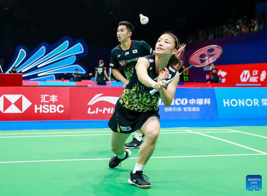 Yamashita Kyohei/Shinoya Naru (front) of Japan compete during the mixed doubles second round match against Zheng Siwei/Huang Yaqiong of China at the China Masters Badminton Tournament 2023 in Shenzhen, south China's Guangdong Province, Nov. 23, 2023. (Photo by Peng Zhigang/Xinhua)