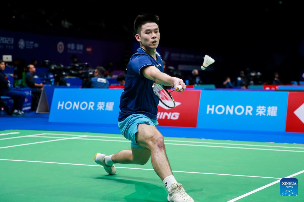 Kunlavut Vitidsarn of Thailand hits a return during the men's singles second round match against Nishimoto Kenta of Japan at the China Masters Badminton Tournament 2023 in Shenzhen, south China's Guangdong Province, Nov. 23, 2023. (Photo by Peng Zhigang/Xinhua)