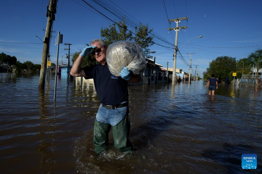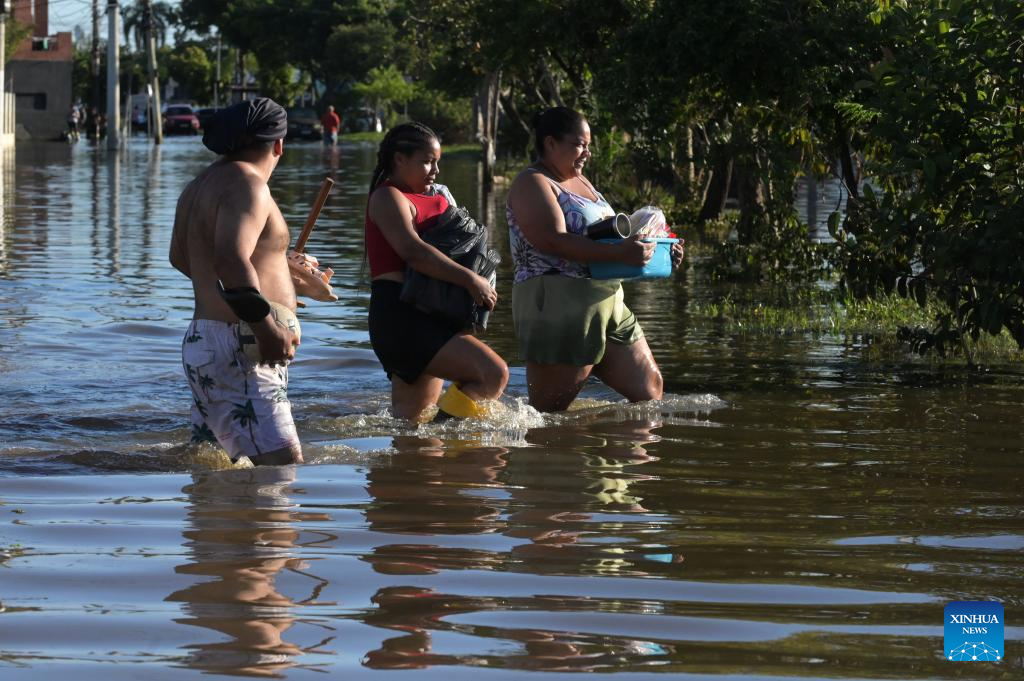 Residents walk through a flooded street in Eldorado do Sul, Rio Grande do Sul, Brazil, Nov. 23, 2023. (Photo by Lucio Tavora/Xinhua)