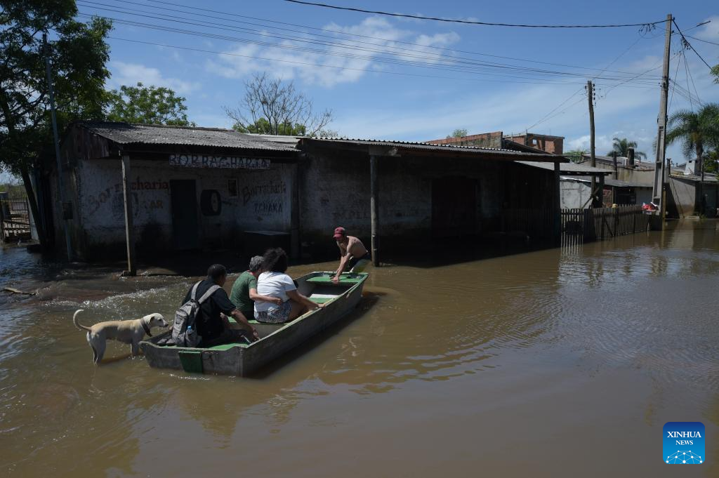 A resident pulls a boat with people through a flooded street in Rio Grande do Sul, Brazil, Nov. 23, 2023. (Photo by Lucio Tavora/Xinhua)