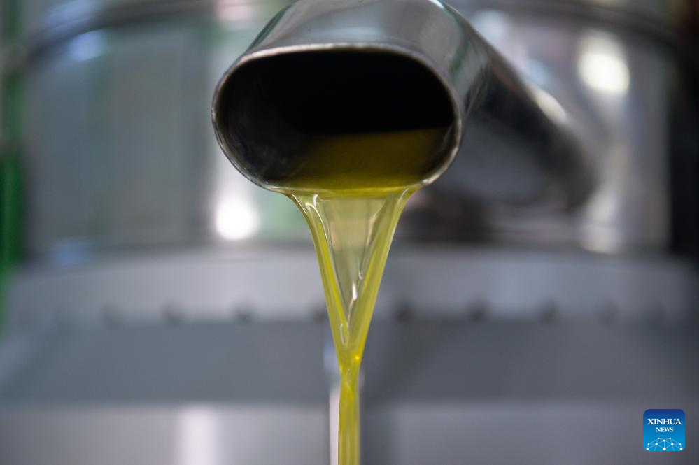 This photo taken on Nov. 24, 2023 shows the olive oil produced at an olive oil factory in Caceres, Spain. Spain is one of the largest olive oil producers in the world. However, heat waves and droughts this year have slashed the country's olive output, which in turn pushed up the price of olive oil products on the market. (Photo by Gustavo Valiente/Xinhua)
