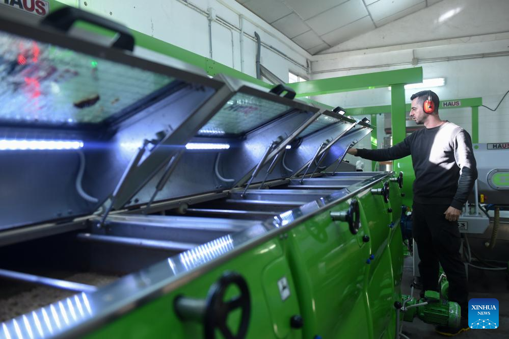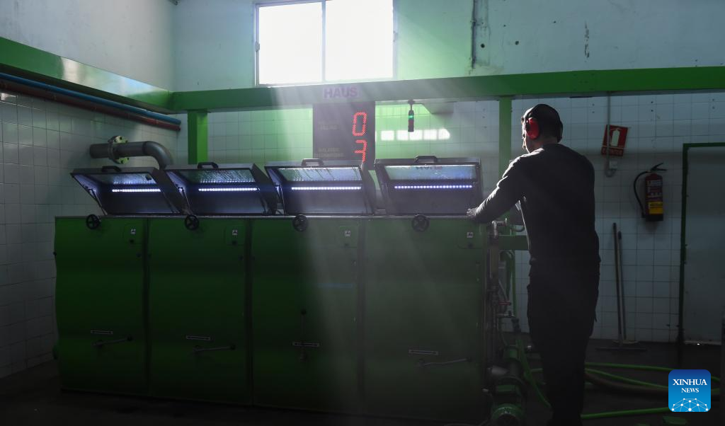 This photo taken on Nov. 24, 2023 shows a staff member working at an olive oil factory in Caceres, Spain. Spain is one of the largest olive oil producers in the world. However, heat waves and droughts this year have slashed the country's olive output, which in turn pushed up the price of olive oil products on the market. (Photo by Gustavo Valiente/Xinhua)