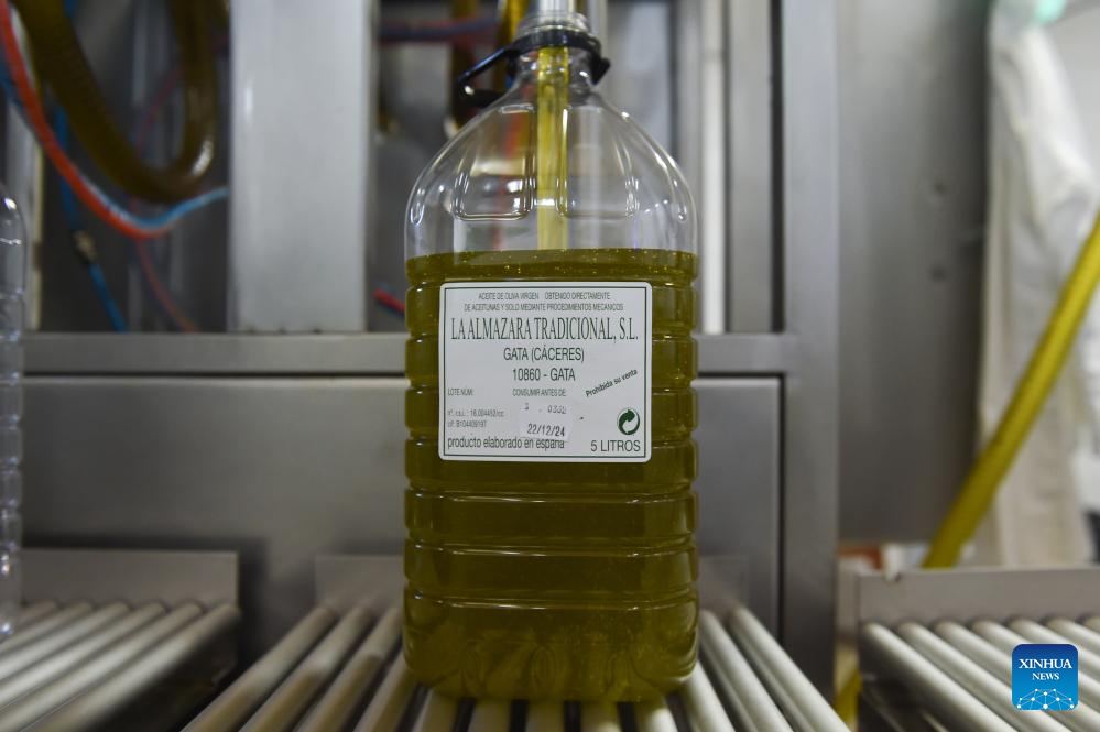 This photo taken on Nov. 24, 2023 shows the olive oil being bottled at an olive oil factory in Caceres, Spain. Spain is one of the largest olive oil producers in the world. However, heat waves and droughts this year have slashed the country's olive output, which in turn pushed up the price of olive oil products on the market. (Photo by Gustavo Valiente/Xinhua)