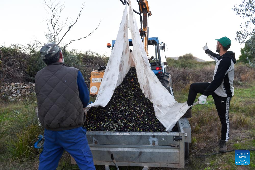 People harvest olives in Caceres, Spain, Nov. 24, 2023. Spain is one of the largest olive oil producers in the world. However, heat waves and droughts this year have slashed the country's olive output, which in turn pushed up the price of olive oil products on the market. (Photo by Gustavo Valiente/Xinhua)