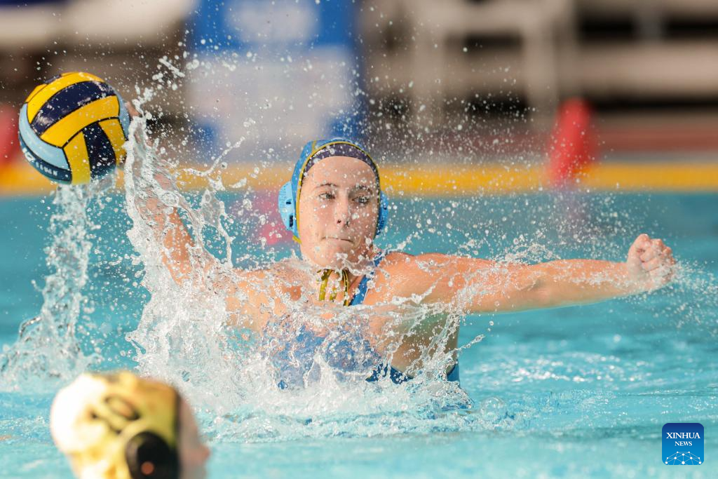 Emma Nicola Macleod (L) of Sport Lisboa E Benfica controls the ball during the quarterfinal water polo match between Sport Lisboa E Benfica and VK Jadran Split of the LEN Challenger Cup in Zagreb, Croatia on Nov. 25, 2023. (Luka Stanzl/PIXSELL via Xinhua)