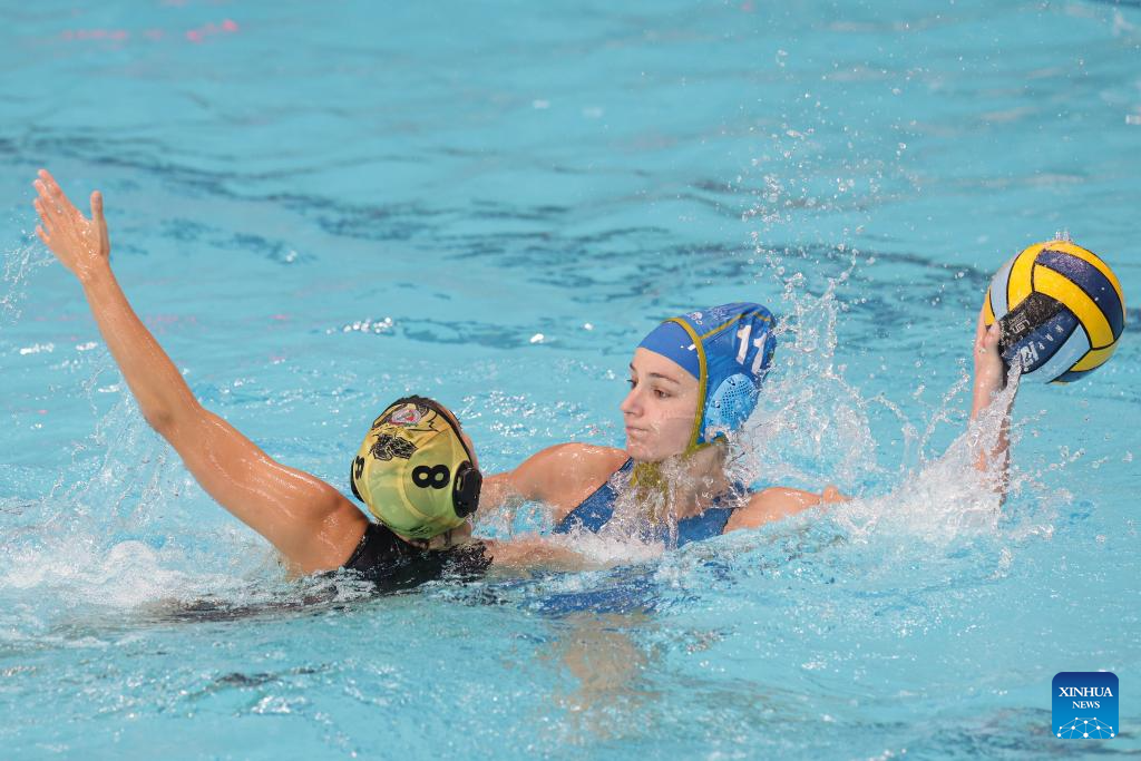 Hristina Ilic (R) of ZVK Crvena Zvezda controls the ball during the gold medal water polo match between ZVK Crvena Zvezda and Izmir Buyuksehir SK at the LEN Challenger Cup Women in Zagreb, Croatia, on Nov. 26, 2023. (Photo by Josip Regovic/PIXSELL via Xinhua)