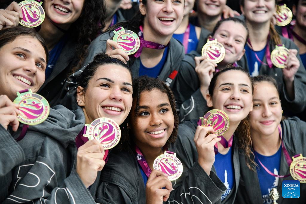 Players of Izmir Buyuksehir SK pose with their gold medals during the awarding ceremony after the gold medal water polo match between ZVK Crvena Zvezda and Izmir Buyuksehir SK at the LEN Challenger Cup Women in Zagreb, Croatia, on Nov. 26, 2023. (Photo by Josip Regovic/PIXSELL via Xinhua)