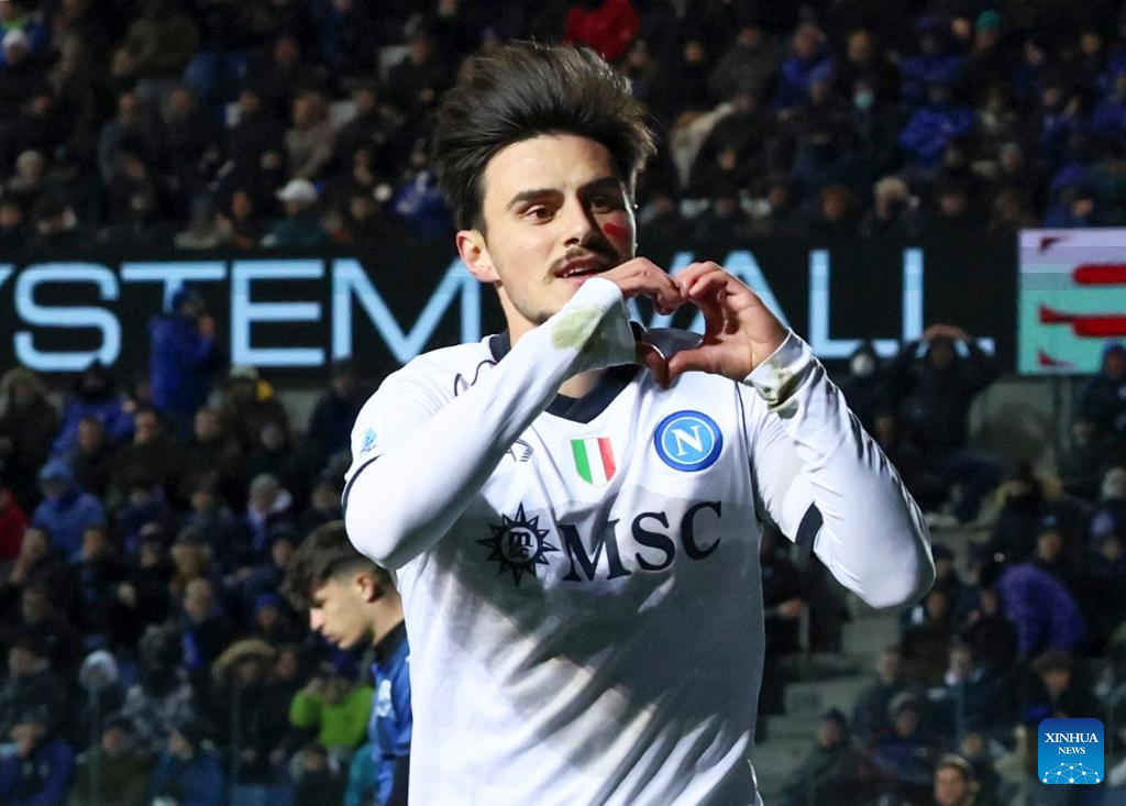 Napoli's Eljif Elmas celebrates his goal during a Serie A football match between Atalanta and Napoli in Bergamo, Italy, Nov. 25, 2023. (Photo by Augusto Casasoli/Xinhua)