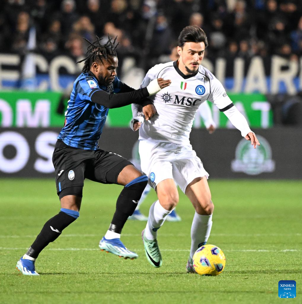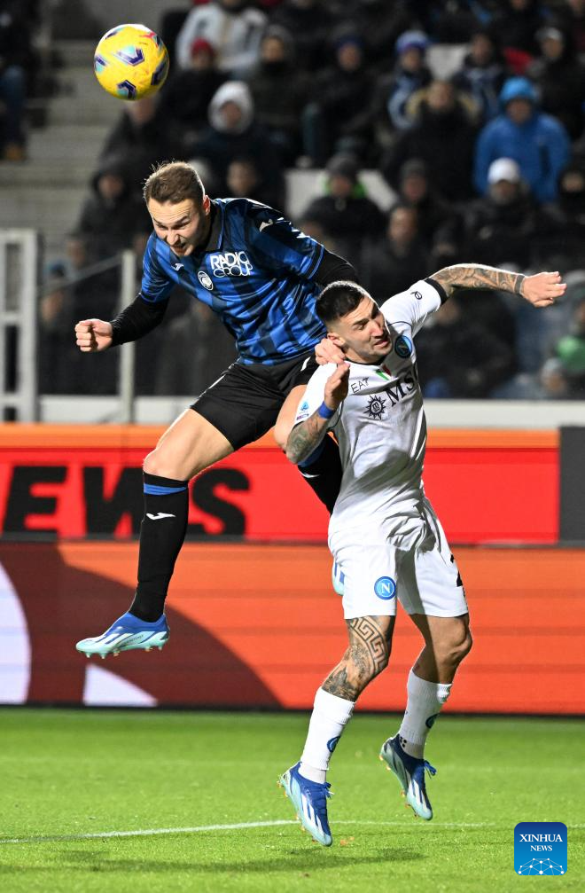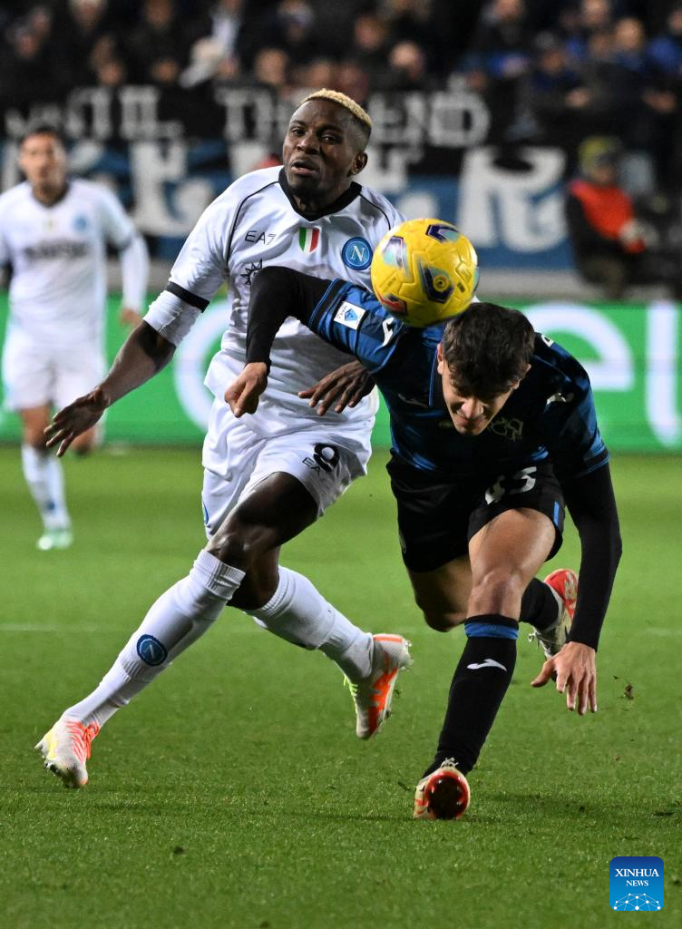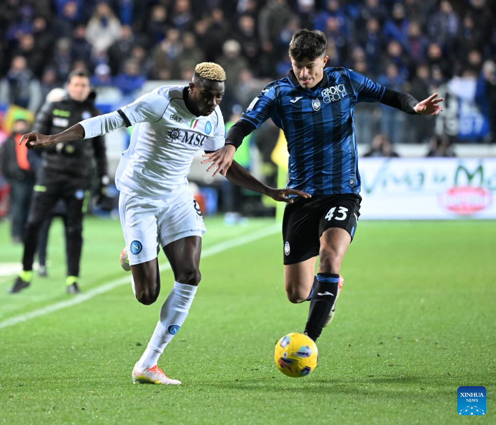 Napoli's Victor Osimhen (L) vies with Atalanta's Giovanni Bonfanti during a Serie A football match between Atalanta and Napoli in Bergamo, Italy, Nov. 25, 2023. (Photo by Augusto Casasoli/Xinhua)