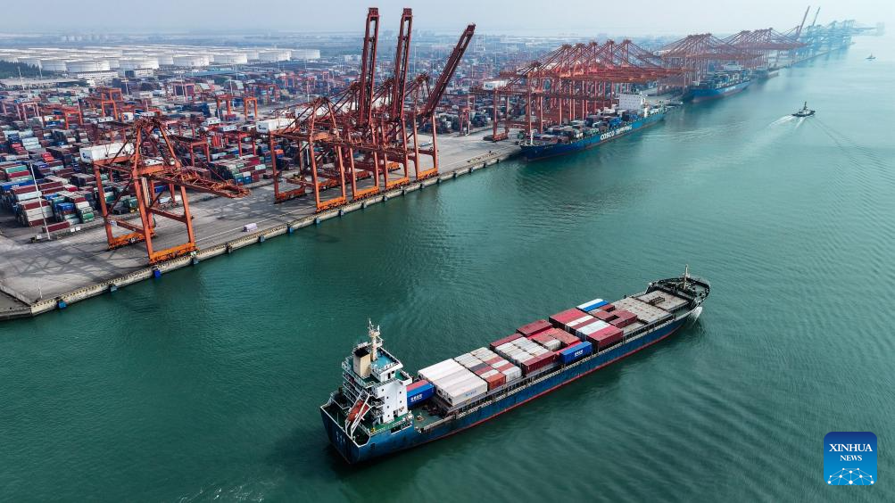This aerial photo taken on Nov. 24, 2023 shows a container vessel sailing toward the berth at the Qinzhou Port in Qinzhou, south China's Guangxi Zhuang Autonomous Region.