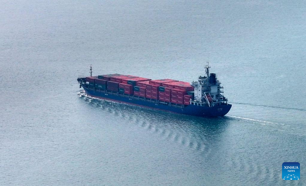 This aerial photo taken on Nov. 24, 2023 shows a container vessel setting off from the Qinzhou Port in Qinzhou City, south China's Guangxi Zhuang Autonomous Region.