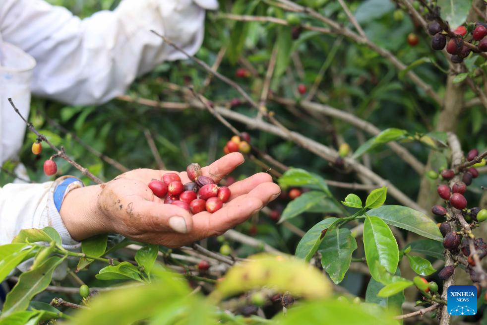 A worker picks up coffee beans at a coffee plantation in Yacuanquer of Narino Province, Colombia, Dec. 1, 2023. La Floresta, a coffee plantation that is over 2,280 meters above sea level in Yacuanquer, has tens of thousands of coffee trees growing on volcanic ash soil. (Xinhua/Zhou Shengping)