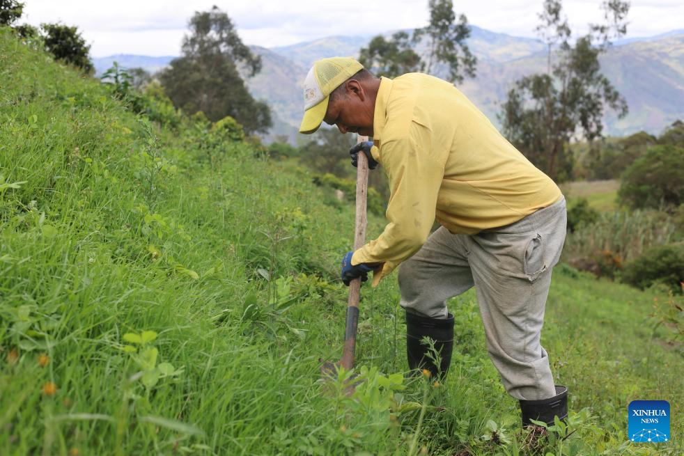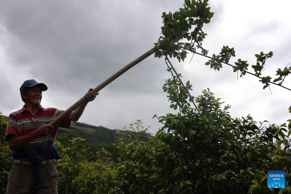A worker gets rid of unnecessary plants which hinder growth of coffee trees at a coffee plantation in Yacuanquer of Narino Province, Colombia, Dec. 1, 2023. La Floresta, a coffee plantation that is over 2,280 meters above sea level in Yacuanquer, has tens of thousands of coffee trees growing on volcanic ash soil. (Xinhua/Zhou Shengping)