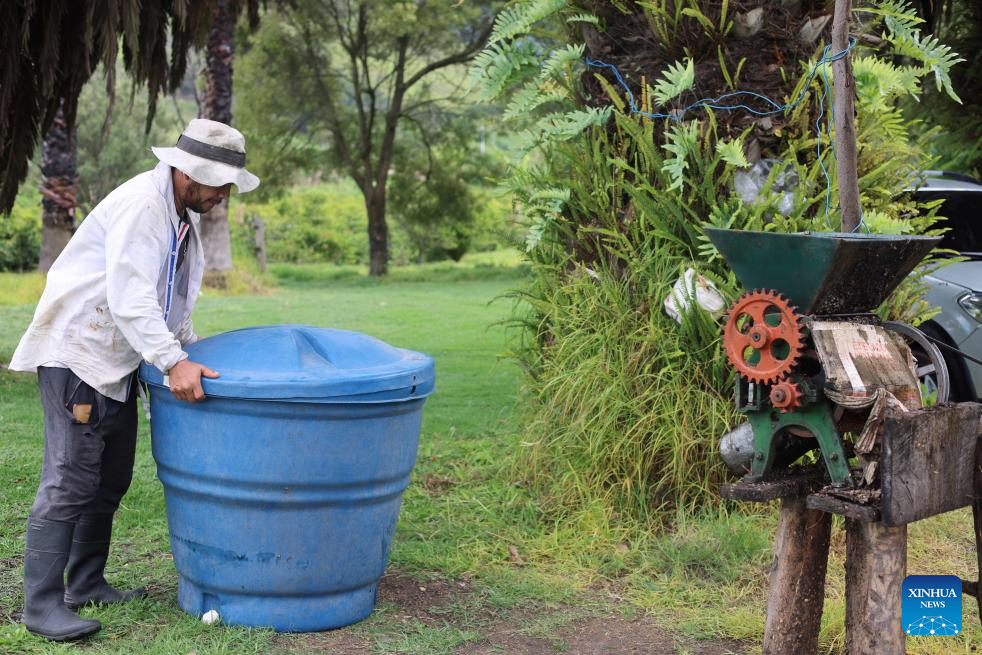 Coffee plantation operator Jose Alberio Guerrero closes the lid of a plastic bucket for coffee beans fermentation in Yacuanquer of Narino Province, Colombia, Dec. 1, 2023. La Floresta, a coffee plantation that is over 2,280 meters above sea level in Yacuanquer, has tens of thousands of coffee trees growing on volcanic ash soil. (Xinhua/Zhou Shengping)