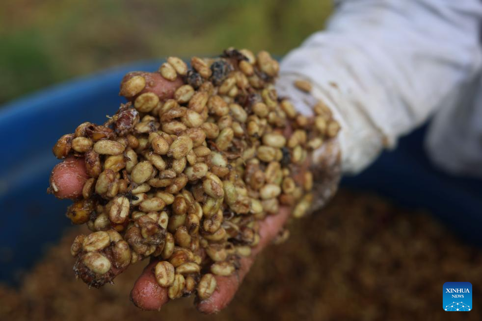 A worker displays naturally fermented coffee beans at a coffee plantation in Yacuanquer of Narino Province, Colombia, Dec. 1, 2023. La Floresta, a coffee plantation that is over 2,280 meters above sea level in Yacuanquer, has tens of thousands of coffee trees growing on volcanic ash soil. (Xinhua/Zhou Shengping)
