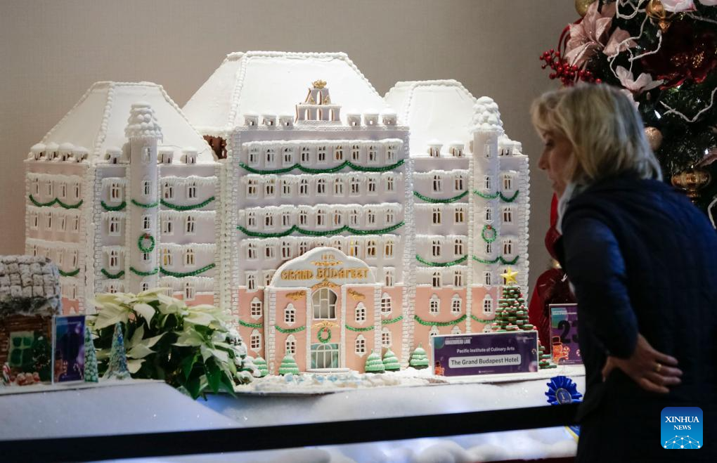 A visitor looks at a gingerbread house at a Gingerbread Lane event in Vancouver, British Columbia, Canada, on Dec. 5, 2023. Over 30 gingerbread houses are displayed during the annual event. (Photo by Liang Sen/Xinhua)