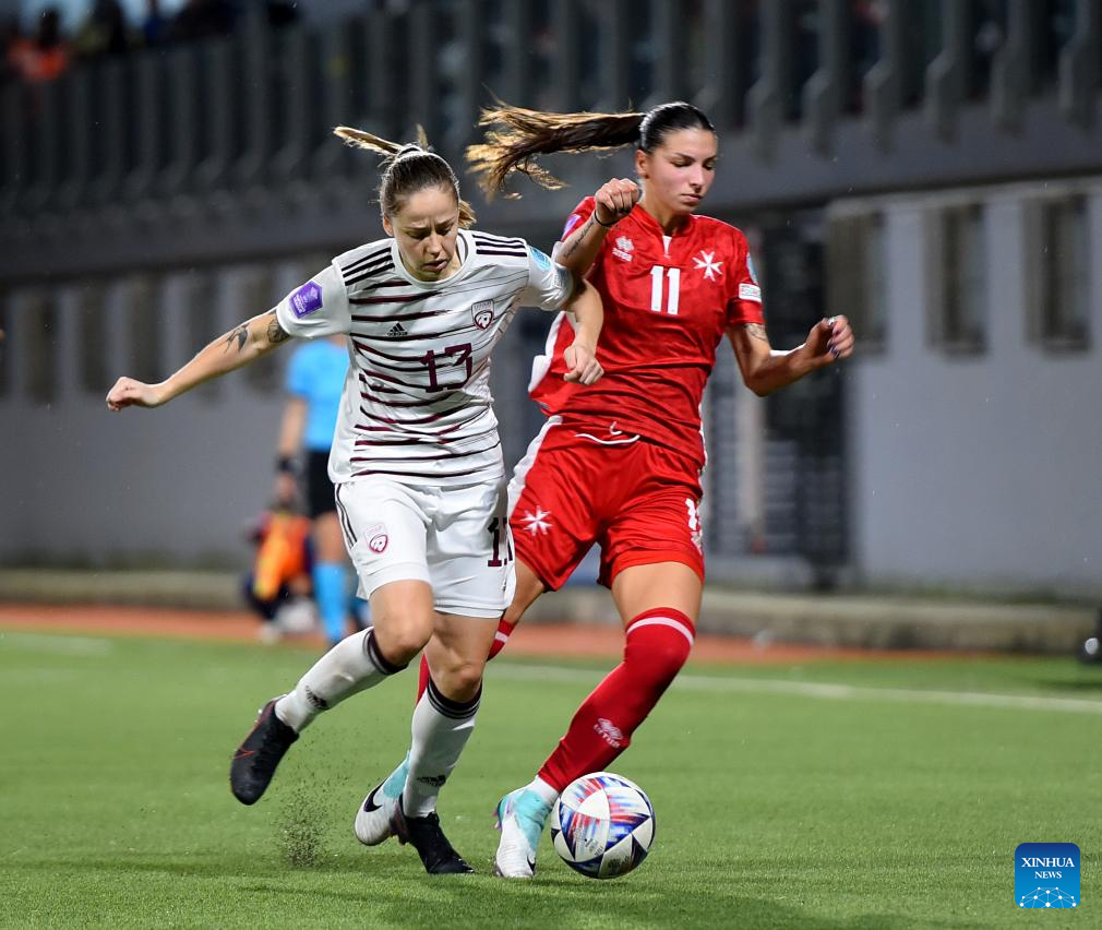 Kailey Willis (R) of Malta vies with Sandra Voitane of Latvia during the UEFA Women's Nations League C, Group C1 match in Ta'Qali, Malta, Dec. 5, 2023. (Photo by Jonathan Borg/Xinhua)