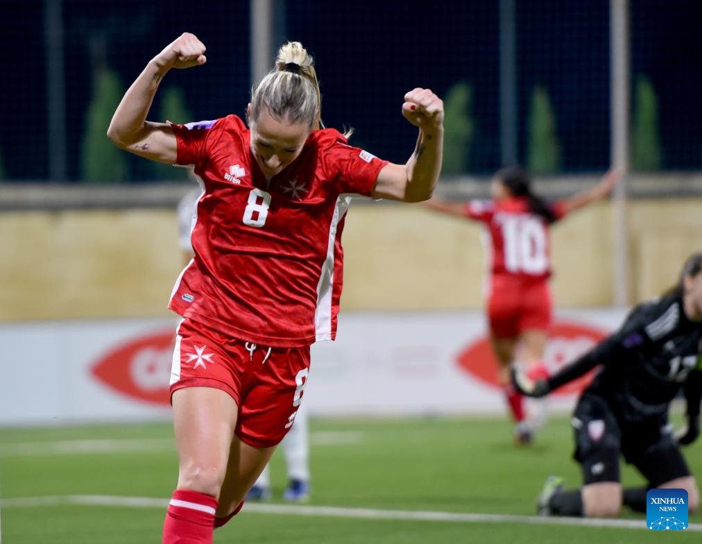 Rachel Cuschieri of Malta celebrates a goal during the UEFA Women's Nations League C, Group C1 match between Malta and Latvia in Ta'Qali, Malta, Dec. 5, 2023. (Photo by Jonathan Borg/Xinhua)