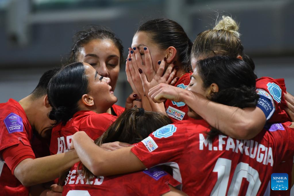 Players of Malta celebrate a goal during the UEFA Women's Nations League C, Group C1 match between Malta and Latvia in Ta'Qali, Malta, Dec. 5, 2023. (Photo by Jonathan Borg/Xinhua)