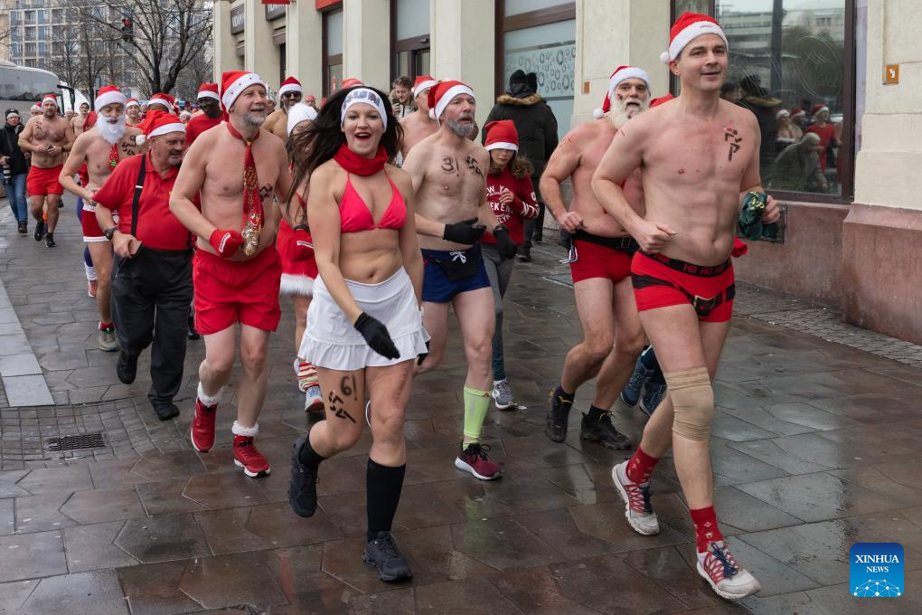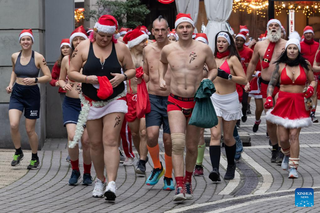 People participate in the 20th Santa Speedo Run to celebrate Christmas and support charity in Budapest, Hungary on Dec. 10, 2023. (Photo by Attila Volgyi/Xinhua)