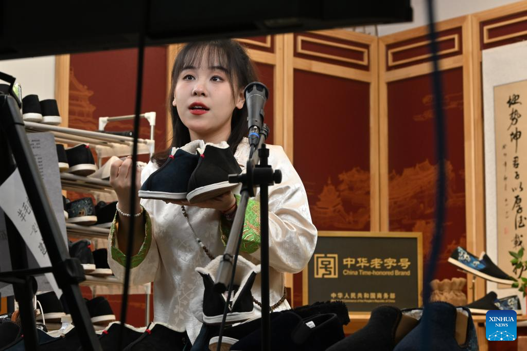 A staff worker sells shoes of Laomeihua via livestreaming in north China's Tianjin, Dec. 8, 2023. Created in 1911, Laomeihua is a century-old brand famous for its handmade shoes and clothes. In recent years, besides focusing on products for the middle-aged and elderly people, Laomeihua has also cultivated "trendy products" and started livestreaming to cater to the young generation. (Xinhua/Li Ran)