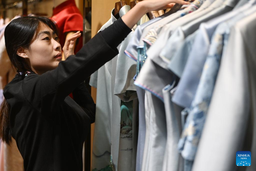 A staff worker arranges clothes at the flagship store of Laomeihua in north China's Tianjin, Dec. 11, 2023. Created in 1911, Laomeihua is a century-old brand famous for its handmade shoes and clothes. In recent years, besides focusing on products for the middle-aged and elderly people, Laomeihua has also cultivated "trendy products" and started livestreaming to cater to the young generation. (Xinhua/Li Ran)