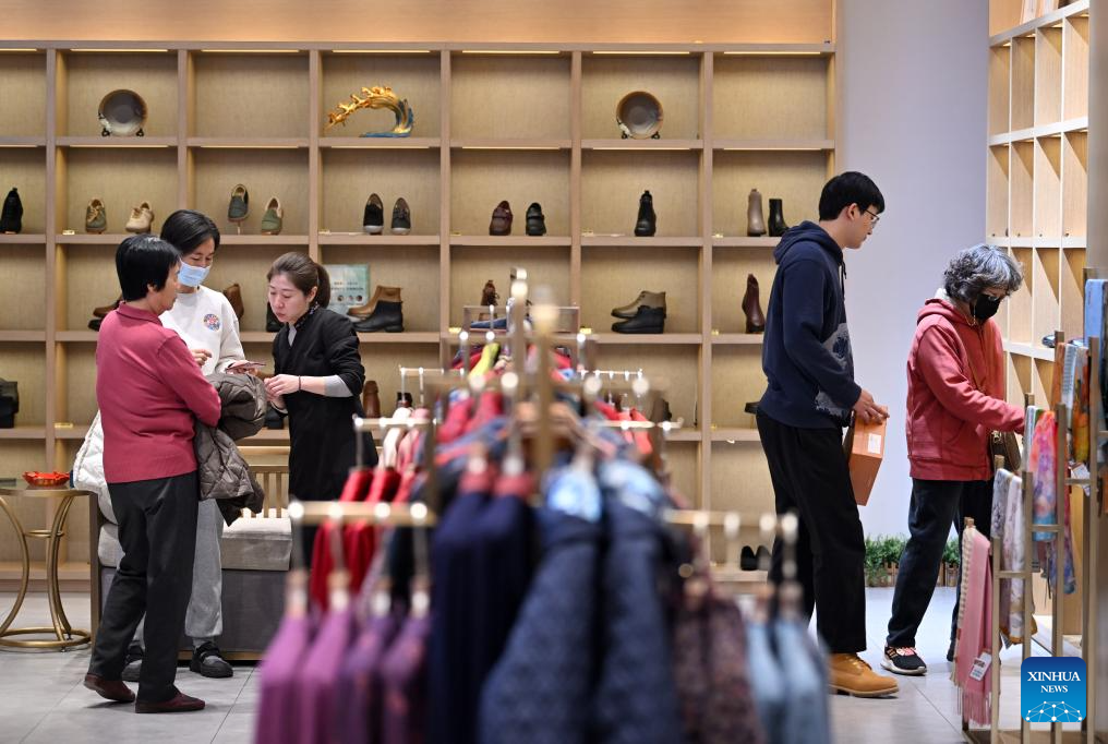 Customers select clothes and shoes at the flagship store of Laomeihua in north China's Tianjin, Dec. 8, 2023. Created in 1911, Laomeihua is a century-old brand famous for its handmade shoes and clothes. In recent years, besides focusing on products for the middle-aged and elderly people, Laomeihua has also cultivated "trendy products" and started livestreaming to cater to the young generation. (Xinhua/Li Ran)