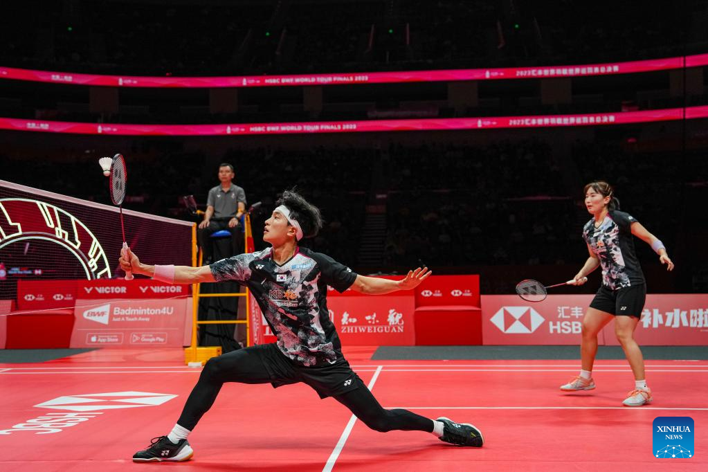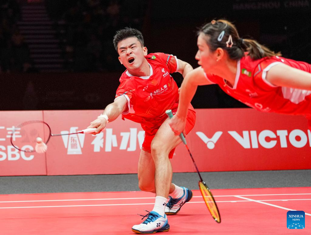 Zheng Siwei(Front)/Huang Yaqiong compete during the mixed doubles group B match between Zheng Siwei/Huang Yaqiong of China and Kim Won Ho/Jeong Na Eun of South Korea at BWF World Tour Finals 2023 in Hangzhou, China, Dec. 14, 2023. (Xinhua/Sun Fei)