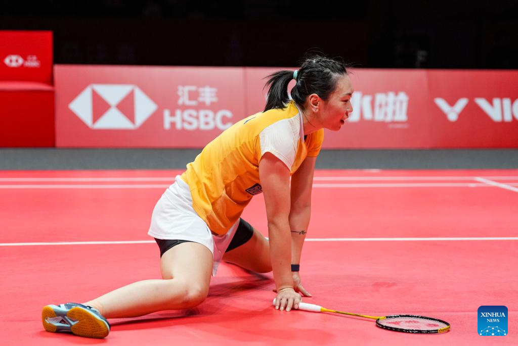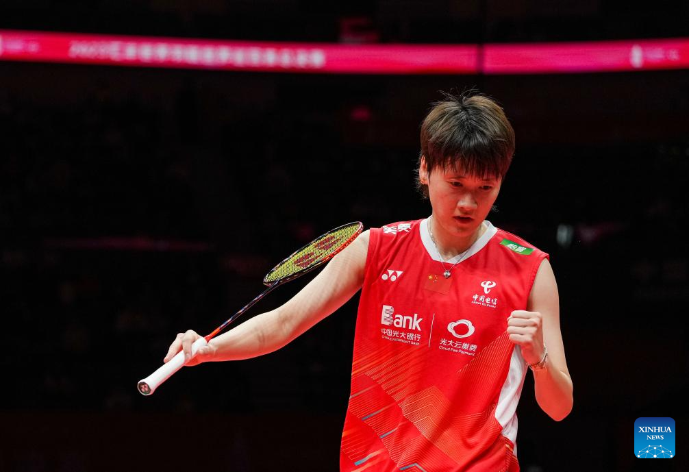 Chen Yufei celebrates during the women's singles group B match between Chen Yufei of China and Zhang Beiwen of the United States at BWF World Tour Finals 2023 in Hangzhou, China, Dec. 14, 2023. (Xinhua/Sun Fei)