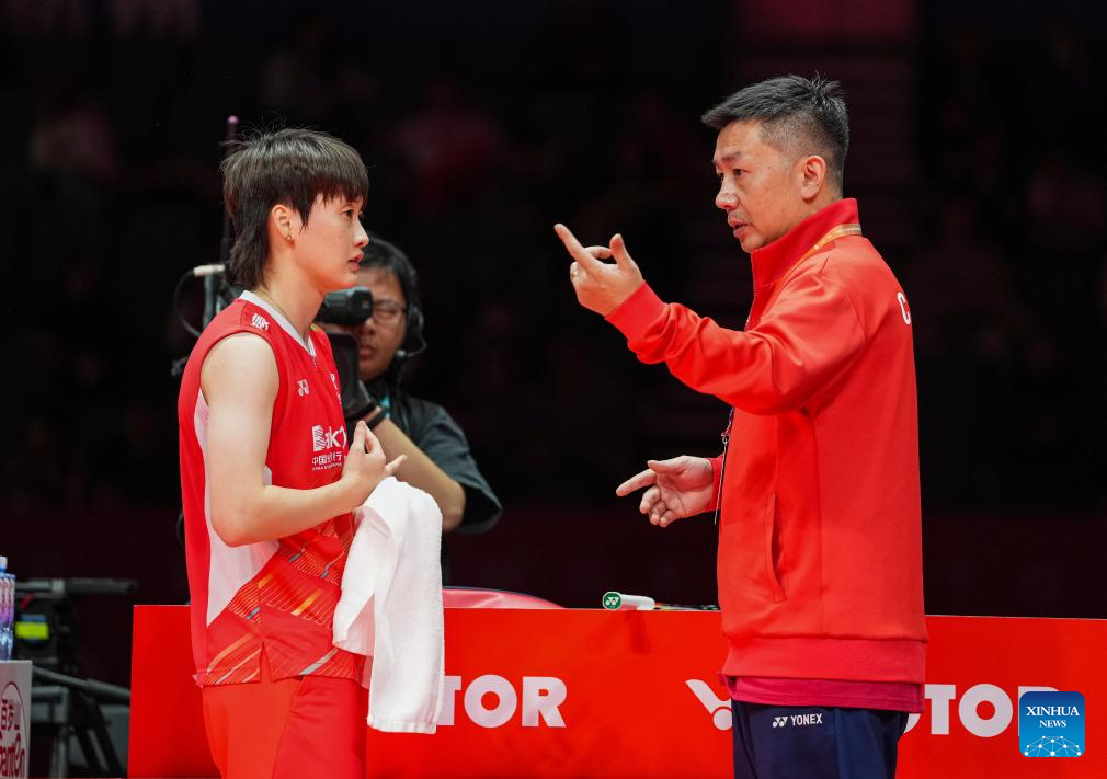 Coach Luo Yigang (R) instructs Chen Yufei during the women's singles group B match between Chen Yufei of China and Zhang Beiwen of the United States at BWF World Tour Finals 2023 in Hangzhou, China, Dec. 14, 2023. (Xinhua/Sun Fei)