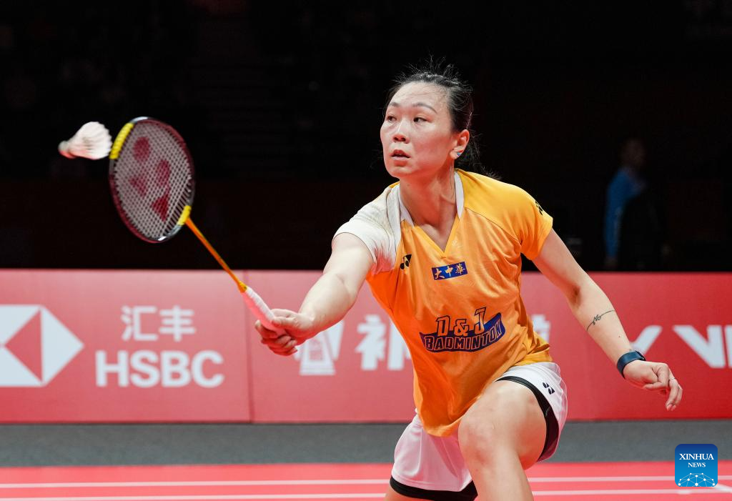 Zhang Beiwen competes during the women's singles group B match between Chen Yufei of China and Zhang Beiwen of the United States at BWF World Tour Finals 2023 in Hangzhou, China, Dec. 14, 2023. (Xinhua/Sun Fei)