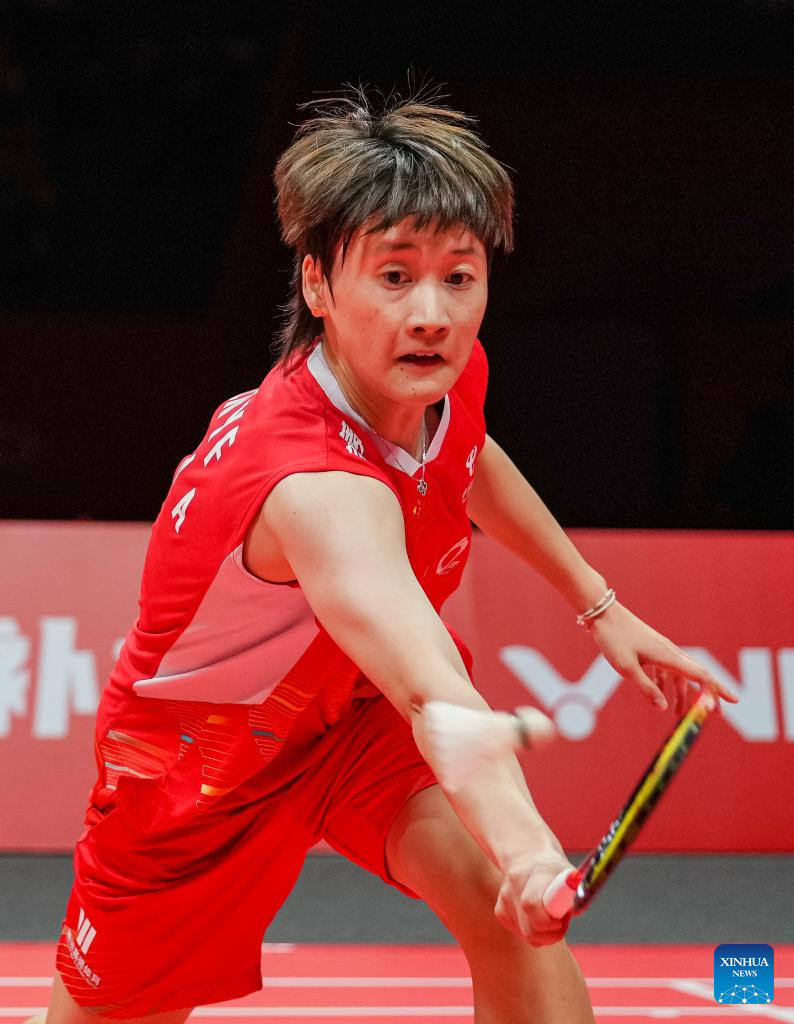 Chen Yufei competes during the women's singles group B match between Chen Yufei of China and Zhang Beiwen of the United States at BWF World Tour Finals 2023 in Hangzhou, China, Dec. 14, 2023. (Xinhua/Sun Fei)