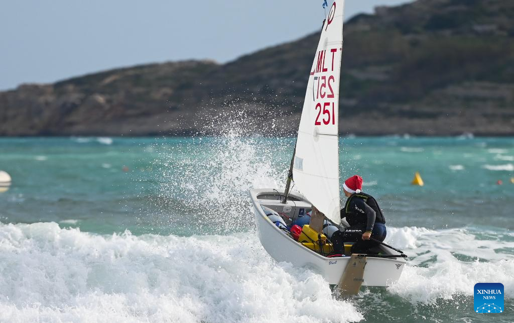 An athlete participates in the sailing race during the 23rd Euromed International Championship at Mellieha Bay, Malta, Dec. 19, 2023. (Photo by Jonathan Borg/Xinhua)