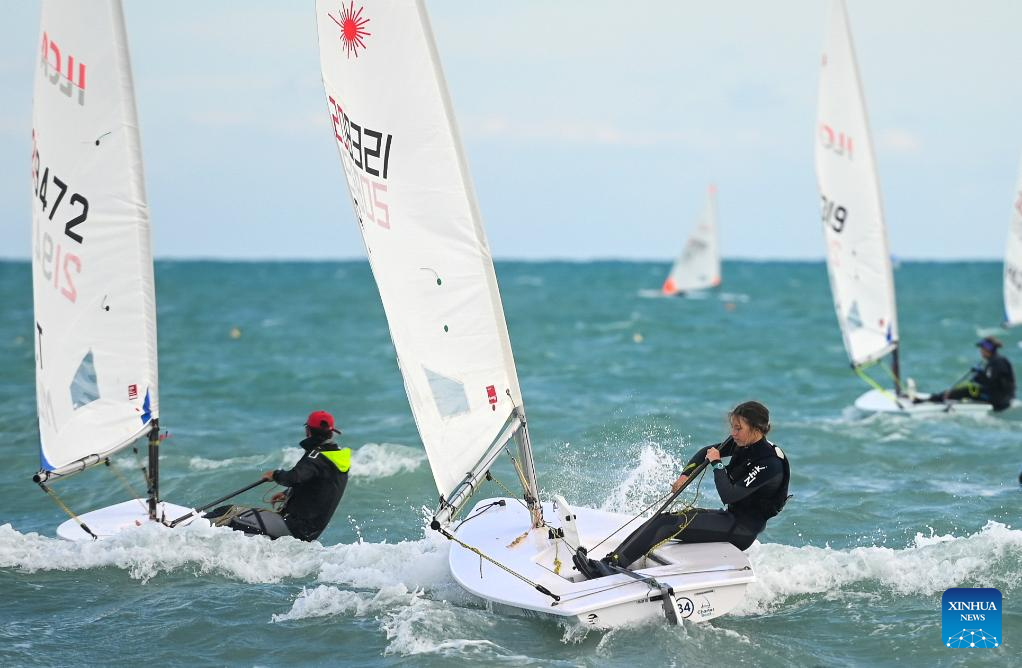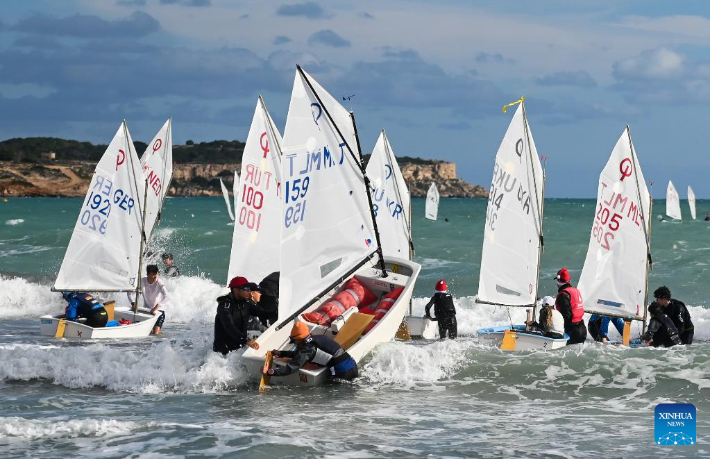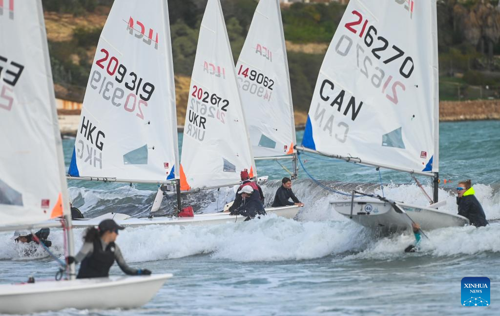 People participate in the sailing race during the 23rd Euromed International Championship at Mellieha Bay, Malta, Dec. 19, 2023. (Photo by Jonathan Borg/Xinhua)