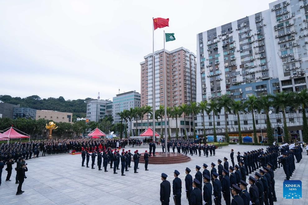 A flag-raising ceremony is held to mark the 24th anniversary of Macao's return to the motherland in south China's Macao Special Administrative Region, Dec. 20, 2023. (Xinhua/Cheong Kam Ka)