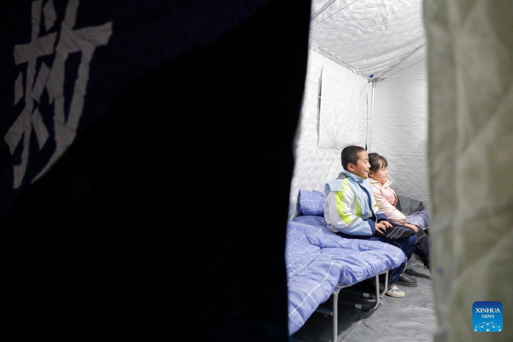 Children are seen in a tent at a temporary shelter in Dahe Village of Jishishan County, northwest China's Gansu Province, Dec. 19, 2023. (Xinhua/Fang Xin)