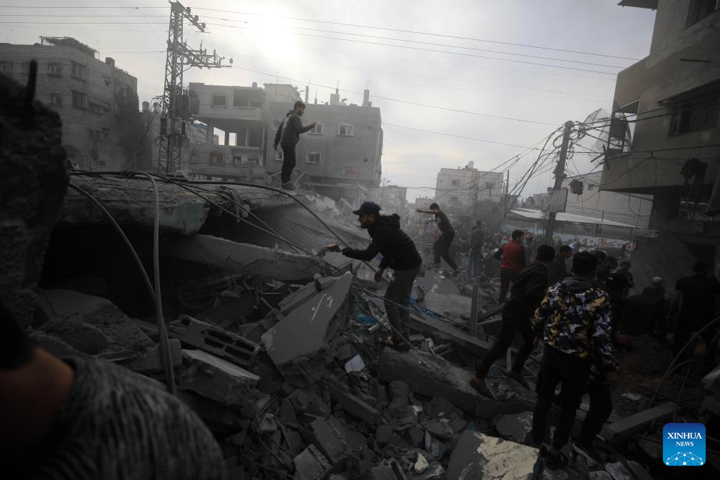 People conduct rescue work after an Israeli airstrike in the southern Gaza Strip city of Rafah, on Dec. 20, 2023. (Photo by Yasser Qudih/Xinhua)