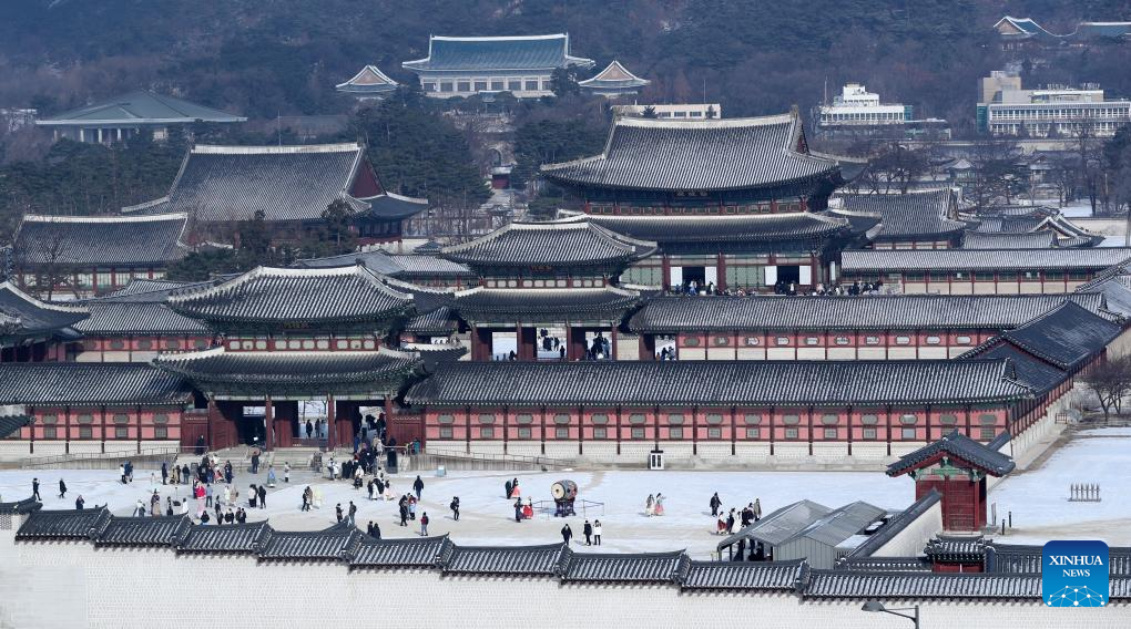 This photo taken on Dec. 20, 2023 shows the snow scenery of Gyeongbokgung Palace in Seoul, South Korea. (Xinhua/Yao Qilin)