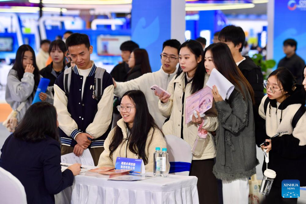Job seekers consult with an employer during the Career Fair of the First Overseas Chinese Talent Conference for Development in Fuzhou, southeast China's Fujian Province, Dec. 20, 2023. (Xinhua/Jiang Kehong)