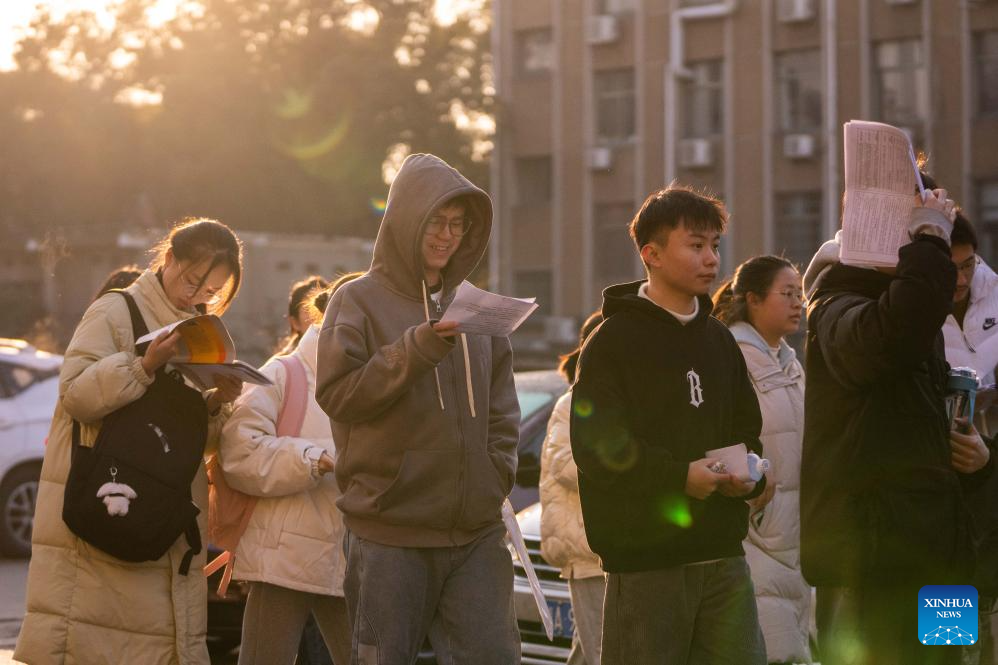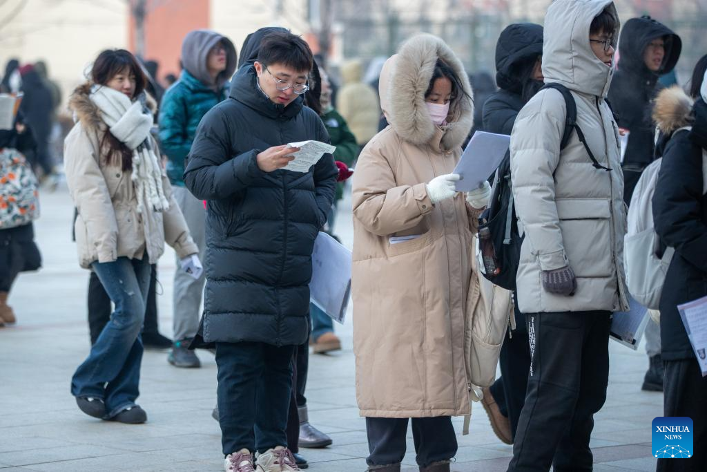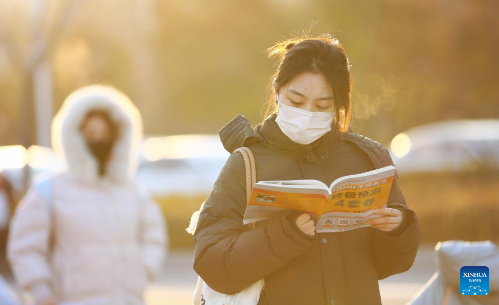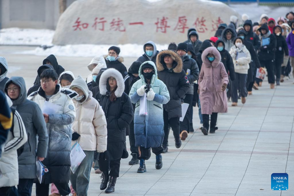 Examinees queue up to enter the examination site of the postgraduate admission exam in Harbin University of Science and Technology in Harbin, northeast China's Heilongjiang Province, Dec. 23, 2023. China's annual national exam for postgraduate enrollment kicked off on Saturday. (Xinhua/Zhang Tao)